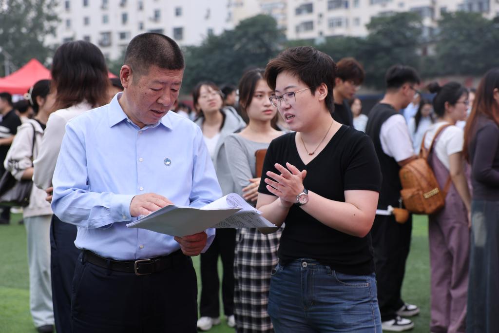 校领导一行深入招聘现场,详细询问参会毕业生的求职意向、简历准备、面试经历及职业规划,仔细倾听毕业生在求职过程中遇到的压力与困惑,并详细听取用人单位对学校人才培养的评价和反馈。